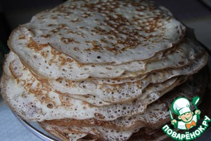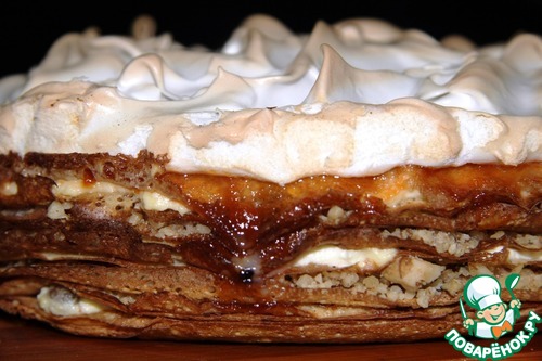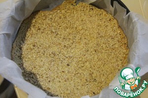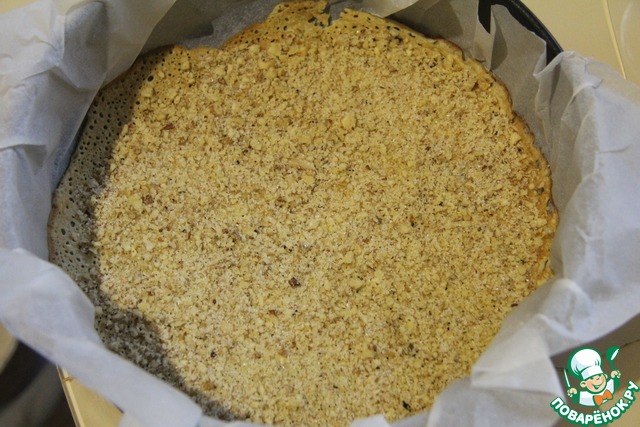 В форму с высокими бортами поместить первый блин и присыпать 2-мя ложками молотых орехов с сахаром (я везде брала сахар по вкусу из общего указанного количества). Выложить еще блином и повторить. -