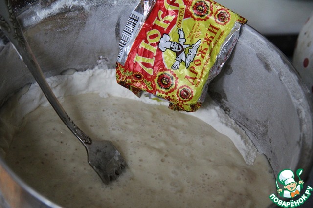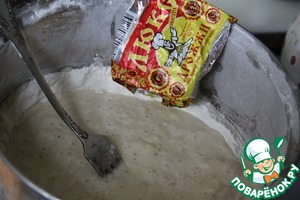 Когда опара будет готова (она начнет немного опадать и появятся трещинки на поверхности), добавить остальные ингридиенты (сода добавляется в самом конце) по рецепту, хорошо перемешать, дать немного тесту постоять.