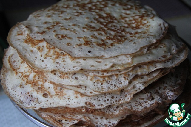 Сначала приготовим тонкие дрожжевые блины. Всю муку просеять в большую чашку или кастрюлю. Для опары дрожжи перетереть с 2 ст. л. сахара, влить теплую сыворотку, добавить около полстакана муки из общей массы. Все хорошо перемешать и вылить в углубление в муке. Дать опаре подойти.