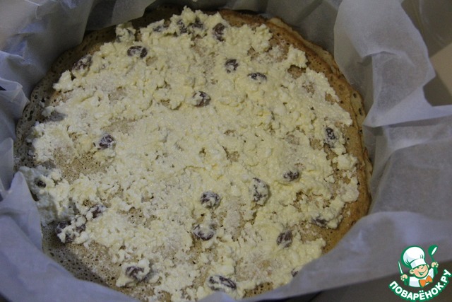 Накрыть следующим блином. Выложить 2 ложки творожной начинки (творог смешать с сахаром по вкусу, добавить 2 желтка, щепотку соли и изюм) и распределить равномерно по всей поверхности.