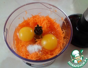 Сырую морковь натереть на мелкой терке, сложить в чашу блендера, добавить соль и яйца, пробить до однородности.