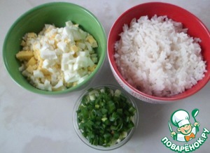 Заранее отварить рис и яйца. Яйца нарезать кубиками, зеленый лук нарезать мелко. -