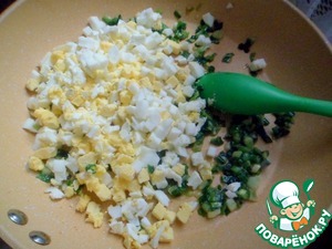 В 2 ст. л. сливочного масла обжарить слегка зеленый лук, добавить к нему нарезанные яйца, перемешать.