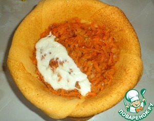 Накрыть рыбную начинку блином и сверху уложить морковную смесь, слегка смазывая отложенным соусом, буквально столовую ложку.