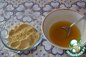 Огуречный рассол слегка подогреть, но, чтобы он не был слишком горячий. Развести в нём сахар, куркуму, имбирь и сок лимона. Горчицу насыпать в сухую глубокую чашку.