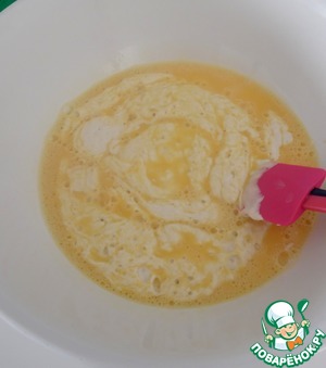 Взбить венчиком яйца со щепоткой соли,3- просеять в миску муку.4-Кефир в тёплом виде влить в яичную массу