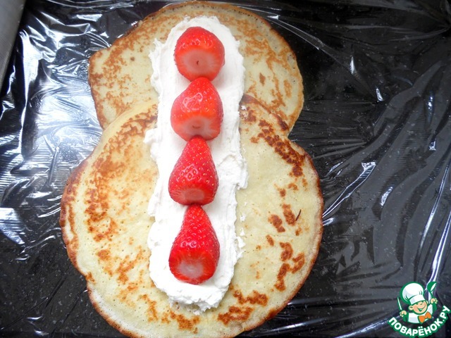 затем выложить ещё 2 блина смазать шоколадом и на них выложить рулет с ягодами, и завернуть, и так далее, выкладывать блины, смазывать шоколадом и заворачивать
