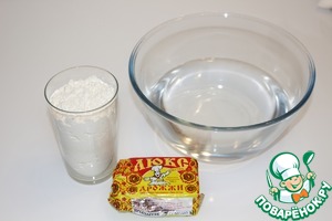В 200 мл теплой воды развести дрожжи, добавить примерно стакан муки и тщательно перемешать.