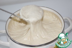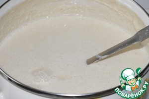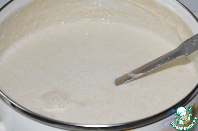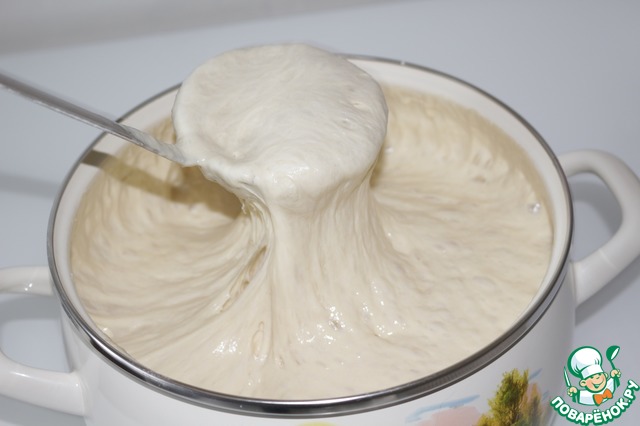 Поставить опару в теплое место примерно на 4 часа, периодически помешивая, чтобы не "убежала".