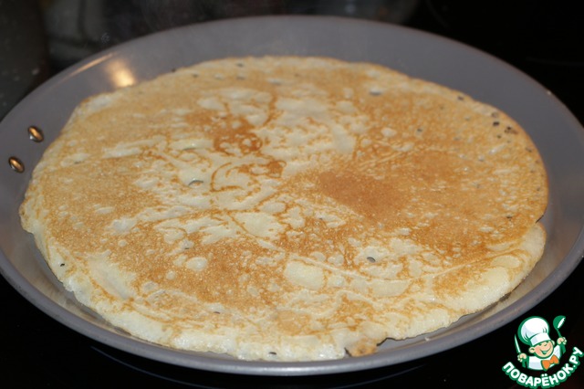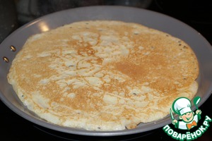 Выпекать блины на раскаленной сковородке, которую следует в самом начале смазать небольшим количеством масла, примерно по 1 минуте с каждой стороны до образования золотистой корочки.