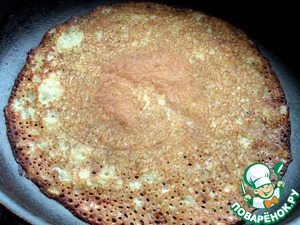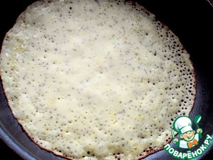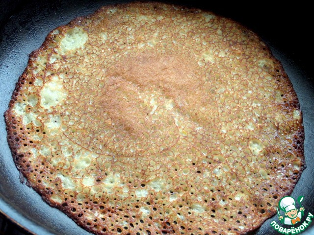 Раскалить сковороду (22 см), смазанную маслом, и налить немного блинного теста.