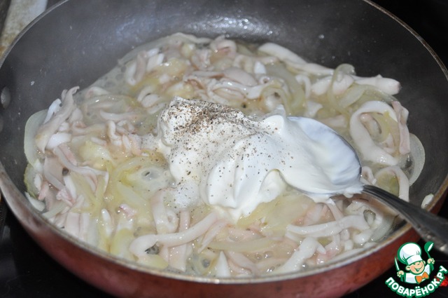 Рецепт «Блинные мешочки с кальмаром по-строгановски»: