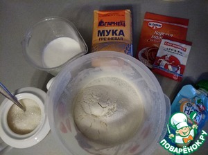 • Соединяем одно с другим. Тесто получается как жидкая сметана. Ставим в теплое место на 30-40 минут.