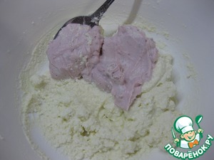 Растереть в однородный крем,- я делала это ложкой и у меня остались небольшие крупинки творога