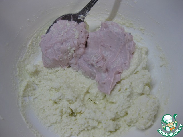 Тщательно перемешать и порциями добавлять сыр, можно детские сырки, - у меня домашний крем-чиз из черничного йогурта