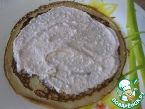 Готовый блин смазываем творожной начинкой