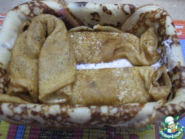 Последний слой я просто сворачивала рулеты без начинки, складывала их пополам и укладывала поперек формы, - вошло 3 блина, надеюсь, понятно обьяснила?