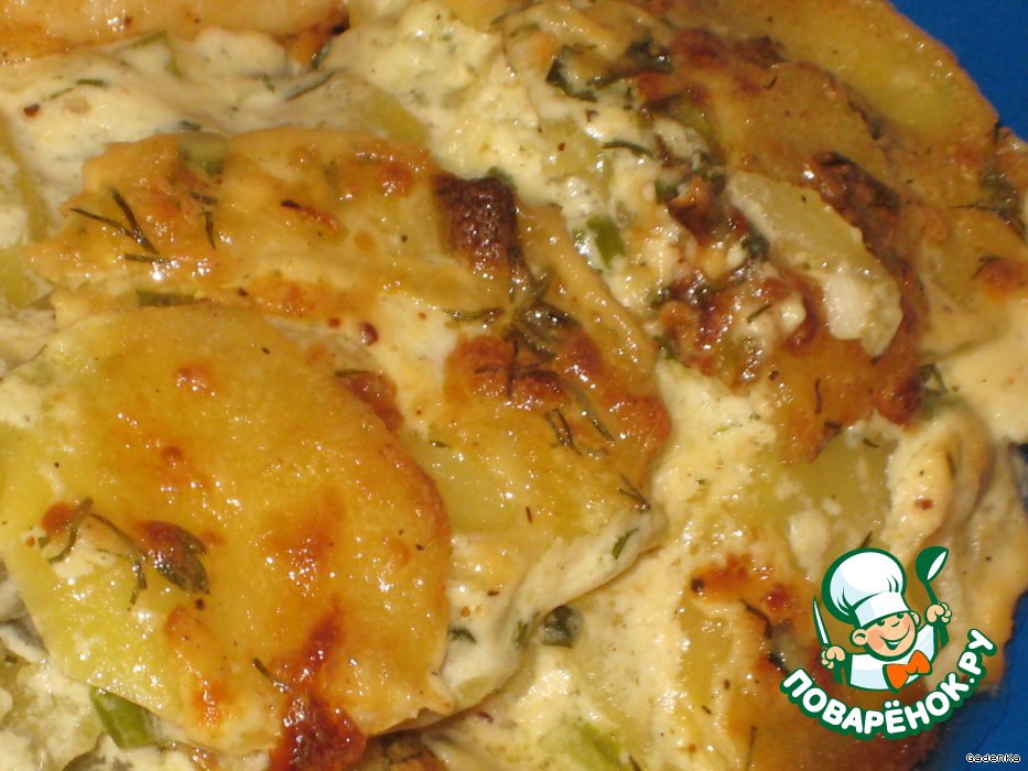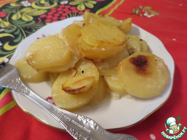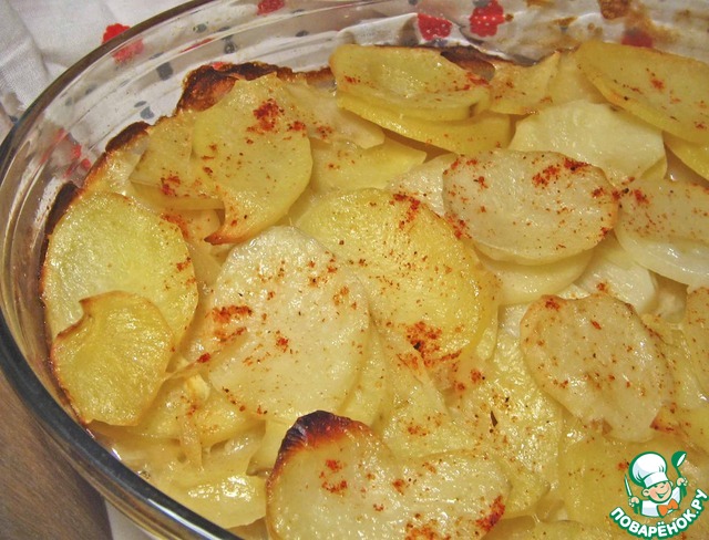 Любите ли вы картошку так, как мой муж?! Я даже иногда ревную ))) По мнению моего благоверного, картошку испортить нельзя, и в любом виде она вкусная, разделяется просто на 4 вида: вкусная, очень вкусная, очень-очень вкусная, и можно и без мяса. Предлагаю вариант гарнира, оцененного моим любимым по последнему варианту. Тоненькие пластинки картошки, слегка припущенные в сливочном соусе и в нем же запеченные в духовке, приправленные имбирем, мускатным орехом, зеленым и жареным репчатым луком. Просто объедение.