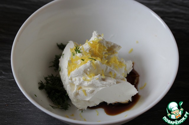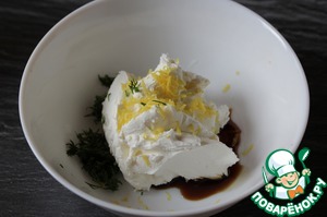 Для намазки со сливочным сыром нужно смешать сыр с соевым соусом, добавить цедру лимона и укроп. -