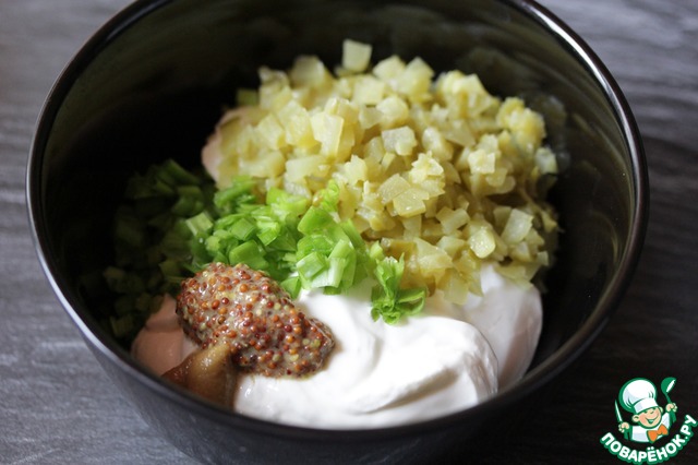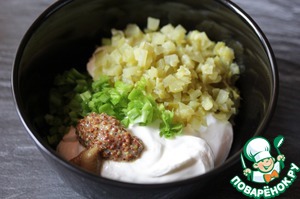 Намазка с маринованными огурчиками: сливочный сыр смешать со сметаной, горчицей, нарезанным зеленым луком и мелко нарезанными маринованными огурчиками. Чуть-чуть присолить.