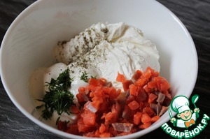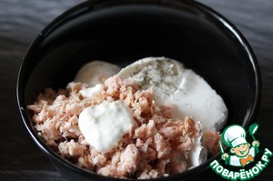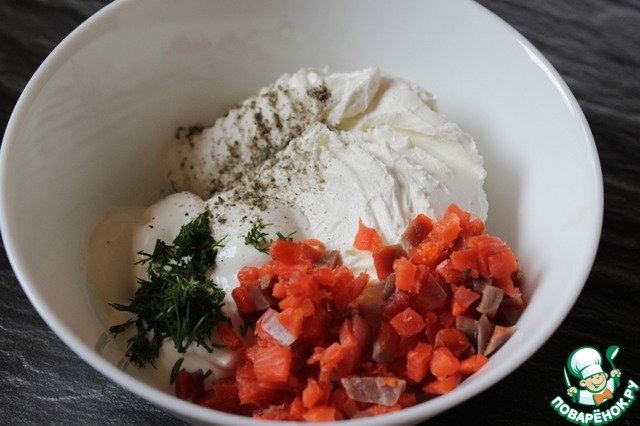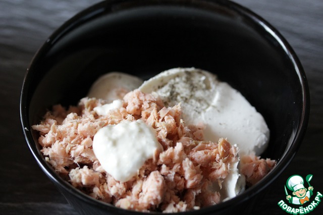 Намазка с копченой рыбой: сливочный сыр смешать со сметаной, солью, лимонным соком, хреном и измельченным рыбным филе (у меня горбуша).