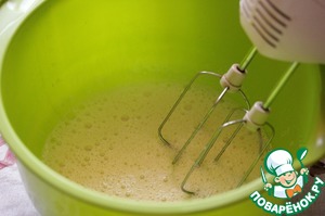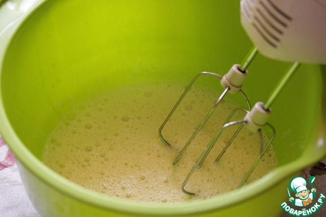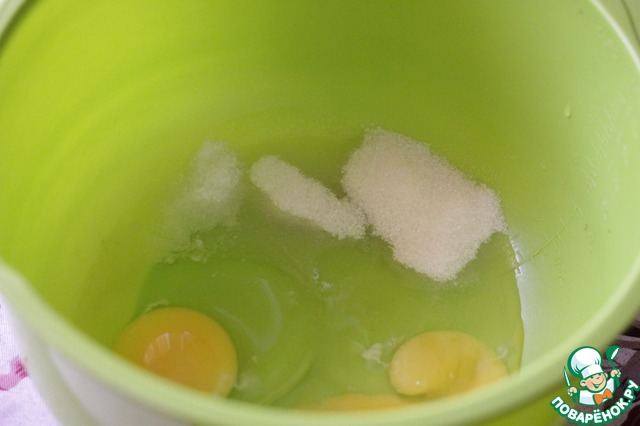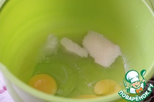 В большую миску всыпать оставшийся сахар и добавить яйца.