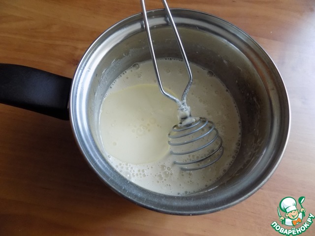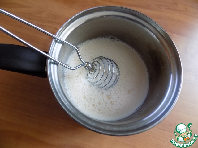 Минут через 15 в загулявшие дрожжи наливаем сливки, соединённые с тёплой водой.. Можно вместо сливок взять молоко с водой один-к-одному. Разбиваем яйцо, добавляем соль и перемешиваем венчиком.