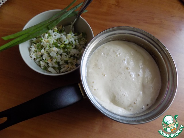 Пока стояло тесто. Я сделала начинку. Сварила рис в подсоленной воде, положила в него сливочное масло. Выложила нужное количество риса в посуду, порубила яйца и мелко порезала лук зелёный. Соединила.