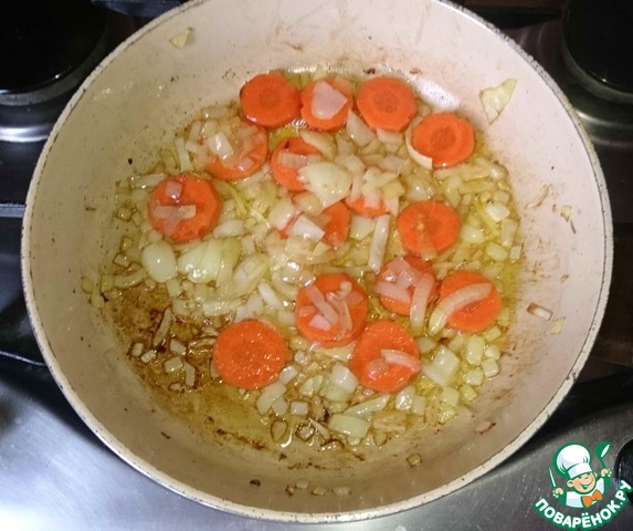 В сковороду где обжаривались овощи добавляем немного растительного масла и тушим на ней морковь с луком до прозрачности лука и средней мягкости моркови. -