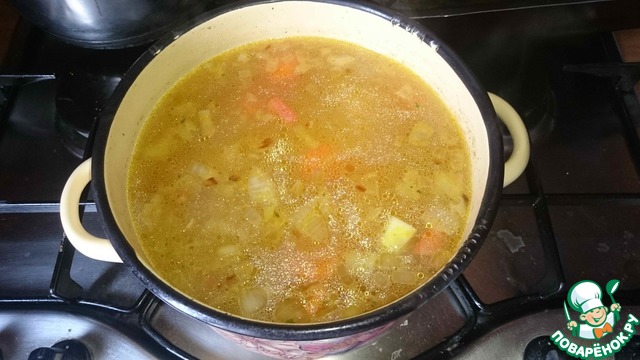 Бульон закипел. Снимаем пену. Закладываем обжаренные овощи. Пару листиков лаврушки, 10-15 горошин черного перца, соль по вкусу.