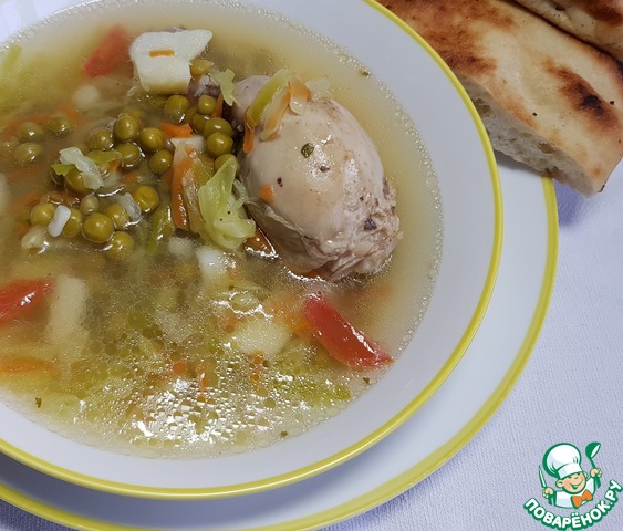 Очень вкусные и легкие щи на курином бульоне. Прозрачный желтоватый бульон, белая капуста и зеленый горошек. Главное не переусердствовать с количеством овощей. Щи должны получиться "жидковатыми", как в Советских столовых. Побольше бульона, поменьше овощей.
