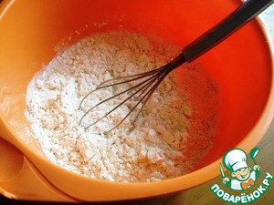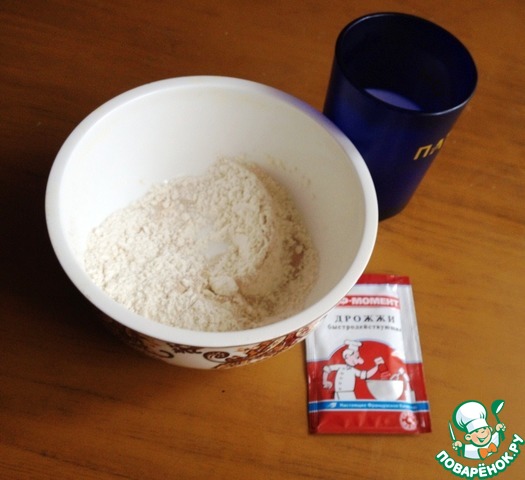 Смешать 2 ст л муки, 1 ч л сахара, дрожжи и щепотку соли. Влить половину молока и горячую воду. Поставить в тёплое место на 30 минут Должна появиться дрожжевая шапочка.