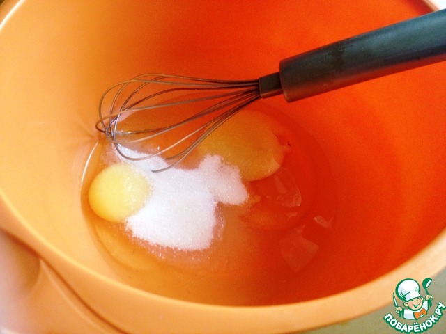Яйца взбить с оставшимися солью и сахаром в пышную пену. Продолжая взбивать влить оставшееся молоко.