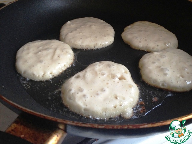Через час разогреть сковороду с растительным маслом. Ложкой выкладывать оладьи и жарить обычным способом с двух сторон.