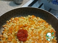 Добавить в сковороду томатную пасту и около 5 столовых ложек чечевичного бульона и немного потомить, где то 5-7 мин. |