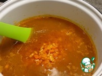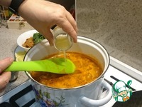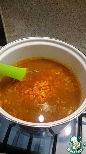 За 5 минут до готовности крупы всыпать в бульон все специи. Перемешать. |