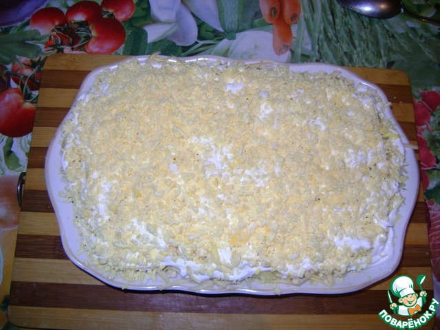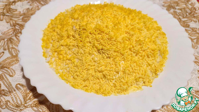 Сверху посыпаем желтком. Ставим в холодильник минимум на 3 часа. На следующий день салат для меня становится ещё вкуснее!