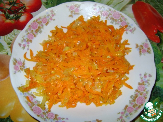 Натёртую на крупной тёрке морковь и мелко нарезанный лук спассеровать до мягкости (не зажаривая!) Приблизительно 10 мин. Переложить в мисочку и дать остыть.
