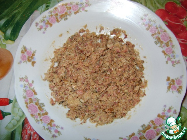 С консервов слить жидкость. Рыбку хорошо размять, удалив косточки и плавнички. Можно добавить пару чайных ложек масла с консервы (для сочности)
