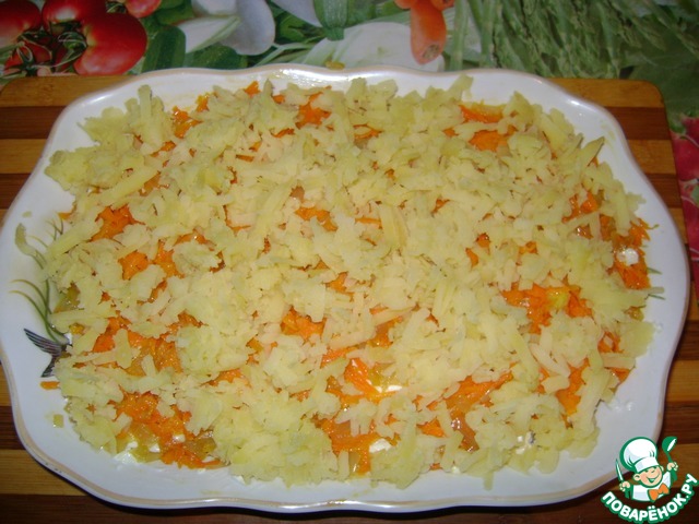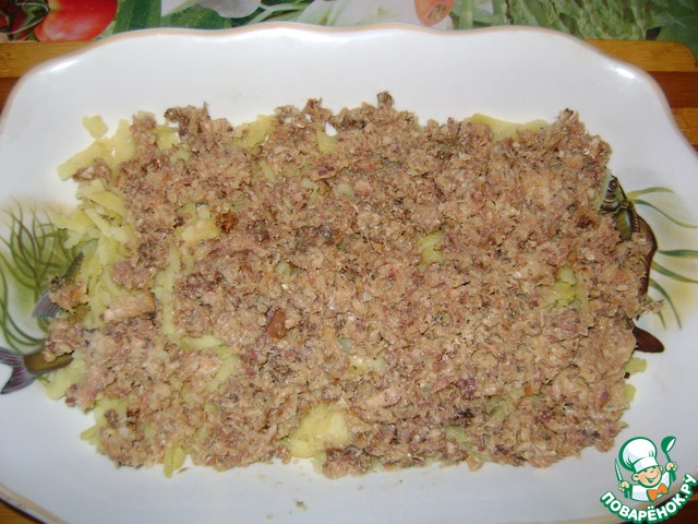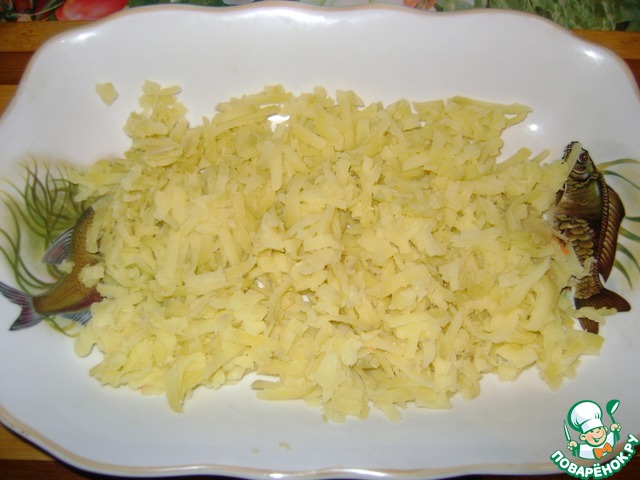 Теперь начинаем собирать салат. Первым слоем идёт половина картофеля