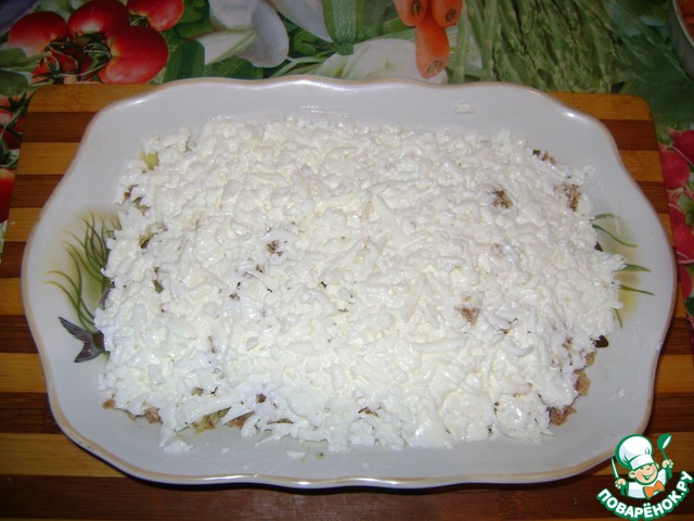 Покрываем сыром и наносим сетку майонеза. Количество майонеза произвольное. Мне захотелось пожирней! Ведь завтра пост ;)