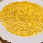Белки отделить от желтков. Белки и сыр натереть на крупной тёрке, желтки - на мелкой.