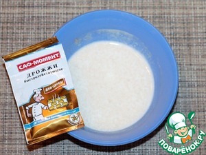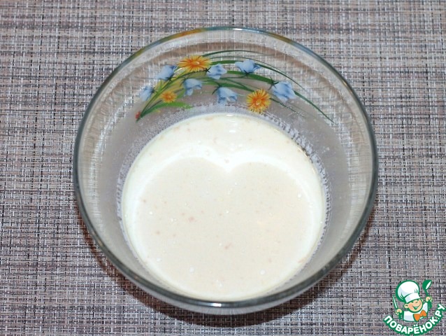 • 1. Приготовим опару. Смешиваем 1 ст. л. муки с дрожжами и 1 ст. л. сахара. Затем добавляем 100 мл молока и перемешиваем. Мучная смесь плохо растворяется в молоке. Но если миску с опарой оставить в теплом месте на 5-10 минут, а затем перемешать, то опара станет однородной и не будет комочков. А через еще 10 минут, образуется пенная шапочка.