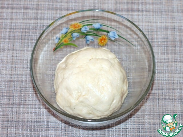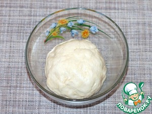 • 4. Собираем тесто в ком. Смазываем чистую миску растительным маслом (1 ч. л.), кладем тесто и прокручиваем. Накрываем миску с тестом пленкой или прозрачным пищевым пакетом. Ставим миску с тестом в теплое место для подъема в 2,5 раза.