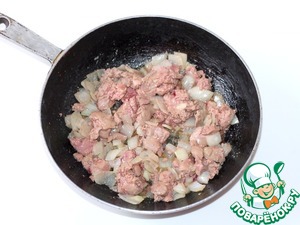 • 5. Приготовим начинку. Очищенный лук нарезаем кубиками и обжариваем на растительном (1 ст. л.) и сливочном (1 ст. л.) масле до прозрачности. Затем добавляем подготовленные и порезанные кусочками куриные сердечки, обжариваем 1-2 минуты до "бела".