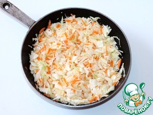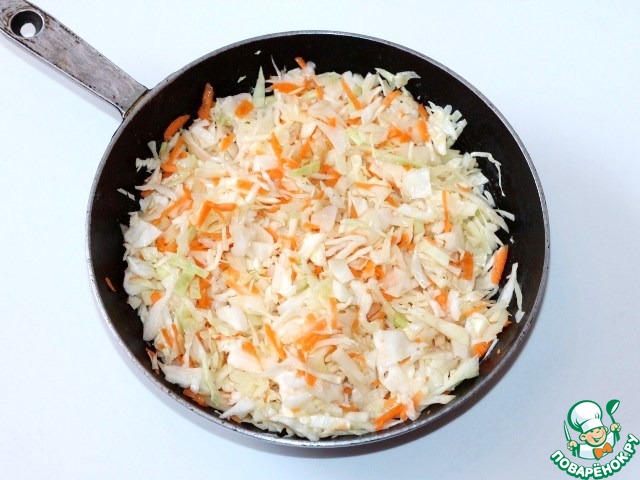 • 7. Мелко нарезаем капусту, трем на крупной терке очищенную морковь и обжариваем на растительном (1 ст. л.) и сливочном масле (1 ст. л.) до готовности с добавлением приправы (0,5 ч. л., у меня смесь трав), перца и соли. Можно добавить 1-2 ст. л. воды. В приготовленную начинку добавляем тертое на крупной терке вареное яйцо. Начинки готовы!