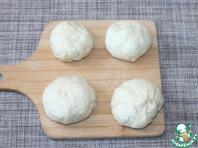 • 8. Тесто обминаем и делим на 4 части. Вес моего теста ~700 грамм.