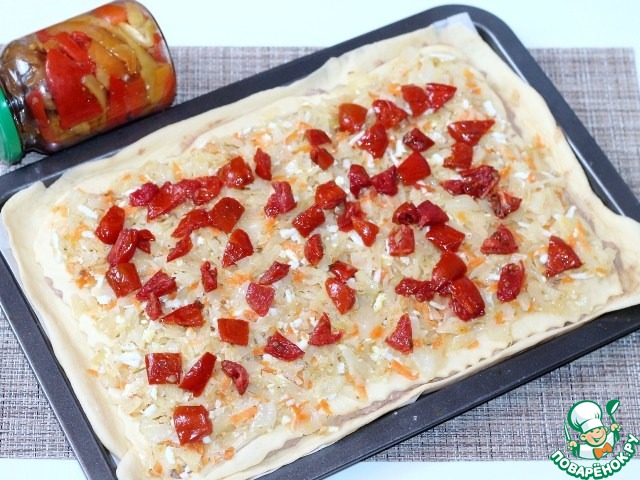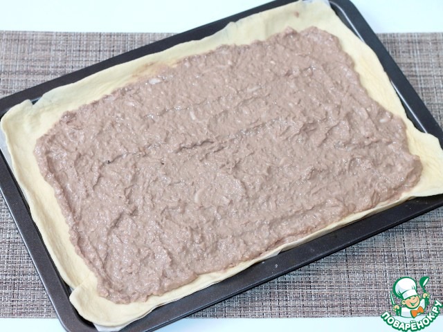 • 10. Выкладываем на тесто начинку из печени. Очередность начинки на ваш вкус.