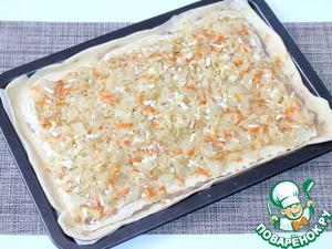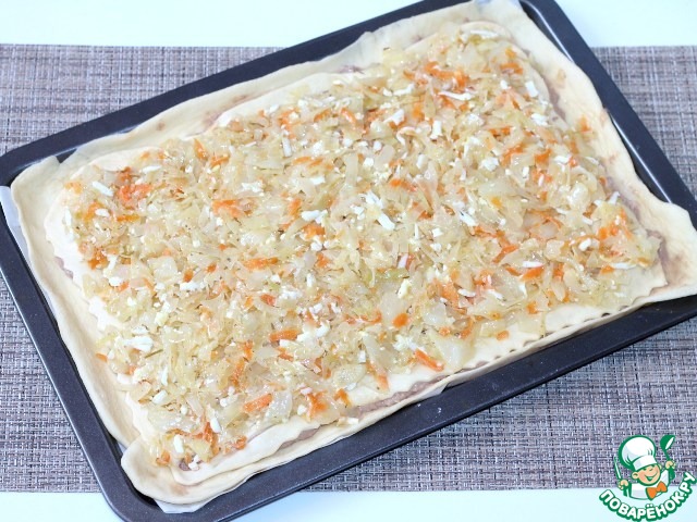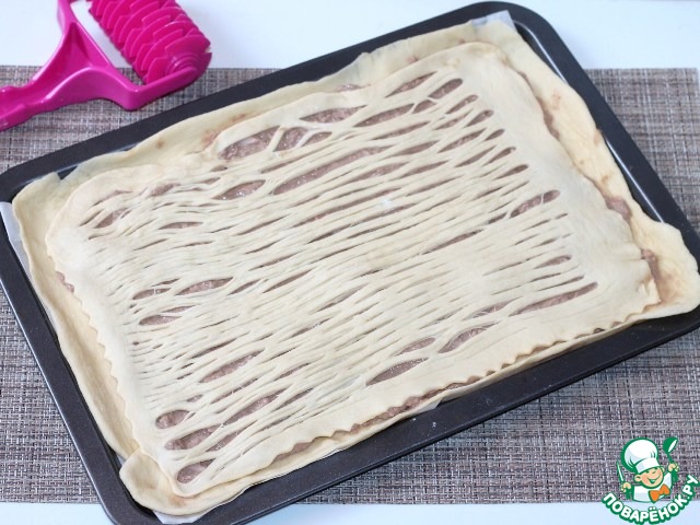 • 9. Две части теста убираем под пленку, а другие 2 части теста обминаем и раскатываем в пласт. При помощи скалки переносим тесто на застеленный и смазанный маслом противень (33*23 см).
