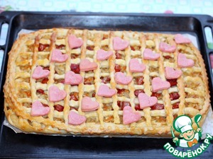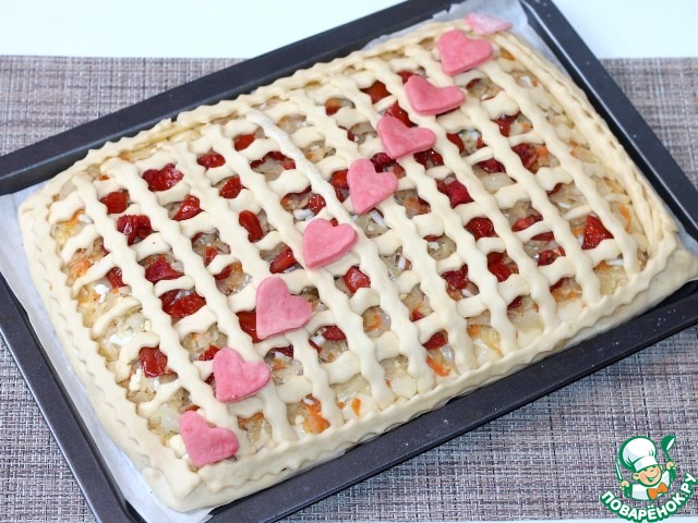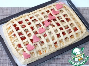• 14. Закрываем начинку раскатанной 4 частью теста. Так как у меня овощная начинка, надо сделать на тесте надрезы. Я решила сделать решетку из верхнего теста и украсить сердечками из остатков теста. Тесто для сердечек, окрашено свекольным соком.